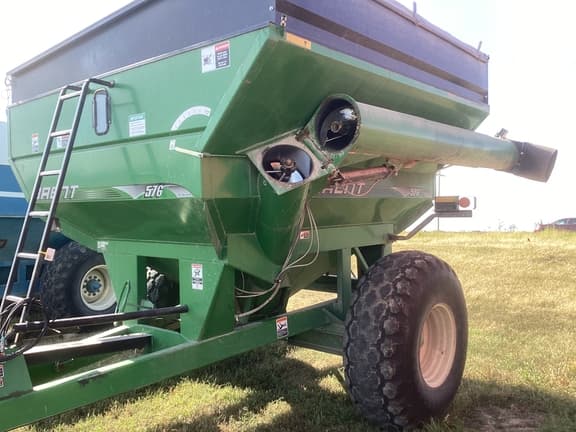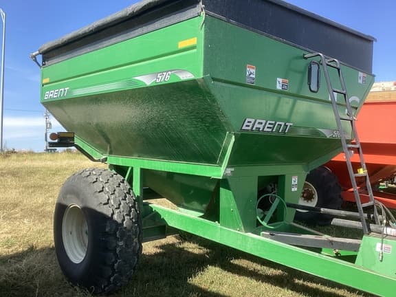 2009 BRENT 596 GRAIN CART, CORNER AUGER, 14" AUGER DIAMETER, 300 BUSHEL PER MINUTE UNLOADING SPEED,24.5X32 BUTTON TIRES, SCALE, TARP, APPROXIMATE WEIGHT UNLOADED 6500 LBS. 130 TRACTOR HP RECOMMENDED.