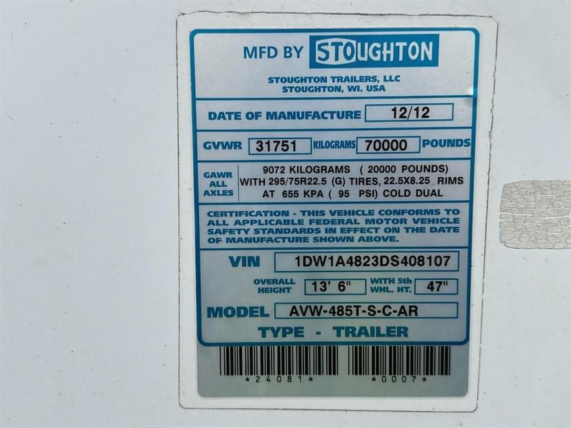 2013 STOUGHTON AVW-485T-S-C Approximately 48FT Length, 102IN Width FULL OPERATIONS NOT TESTED. Front Axle Weight: 20,000 Rear Axle Weight: 20,000 Wheel Type: Steel Tire Size: 295/75R/22.5 Trailer Suspension: Air Ride Door Type: Roll Up ROLL UP DOOR TENSION SPRING REMOVED, PART WITH UNIT. Additional Information: SOLD “AS IS, WHERE IS” WITHOUT WARRANTY OR GUARANTEE, NOTES FOR GUIDANCE ONLY. PRE-PURCHASE INSPECTIONS W/ APPOINTMENT, ENCOURAGED & RECOMMENDED. ITEMS SUBJECT TO LATE STORAGE FEES AND/OR RE-LOCATION AT BUYERS EXPENSE IF NOT REMOVED WITHIN 10 BANKING DAYS OF SALE DATE. LOCATIONS ARE SUBJECT TO LOAD OUT FEES, PER EQUIPMENT- MAKE ARRANGEMENTS ACCORDINGLY. 24 HOUR NOTICE PRIOR TO COLLECTING PURCHASE IS REQUIRED, LOAD OUT WILL BE REFUSED WITHOUT THE 24 HOUR NOTICE. BUYER MUST PRESENT GATE PASS TO LOCATION. HOUSBY DOES NOT PROVIDE FINANCING.
