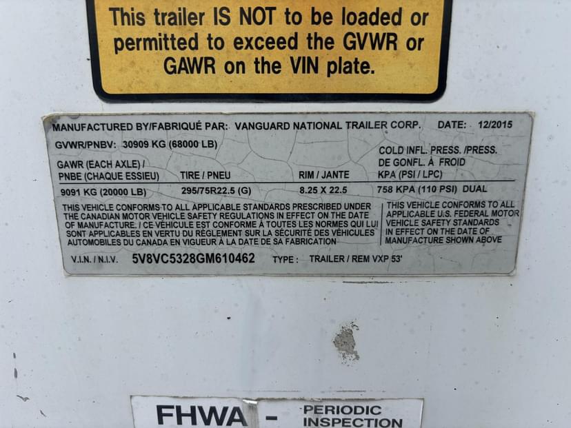 2016 VANGUARD 53 ft FULL OPERATIONS NOT TESTED Length: 53 FT Width: 96 IN Height: 13 FT GVWR: 68,000 LBS GAWR: 20,000 LBS Suspension: Air Ride Rear Door Type: Swing Tire Size: 295/75R22.5 Wheel Type: Steel Weather Seal Strip Damaged SOLD “AS IS, WHERE IS” WITHOUT WARRANTY OR GUARANTEE, NOTES FOR GUIDANCE ONLY. PRE-PURCHASE INSPECTIONS W/ APPOINTMENT, ENCOURAGED & RECOMMENDED. ITEMS SUBJECT TO LATE STORAGE FEES AND/OR RE-LOCATION AT BUYERS EXPENSE IF NOT REMOVED WITHIN 10 BANKING DAYS OF SALE DATE. LOCATIONS ARE SUBJECT TO LOAD OUT FEES, PER EQUIPMENT- MAKE ARRANGEMENTS ACCORDINGLY. 24 HOUR NOTICE PRIOR TO COLLECTING PURCHASE IS REQUIRED, LOAD OUT WILL BE REFUSED WITHOUT THE 24 HOUR NOTICE. BUYER MUST PRESENT GATE PASS TO LOCATION. HOUSBY DOES NOT PROVIDE FINANCING. [Lease]