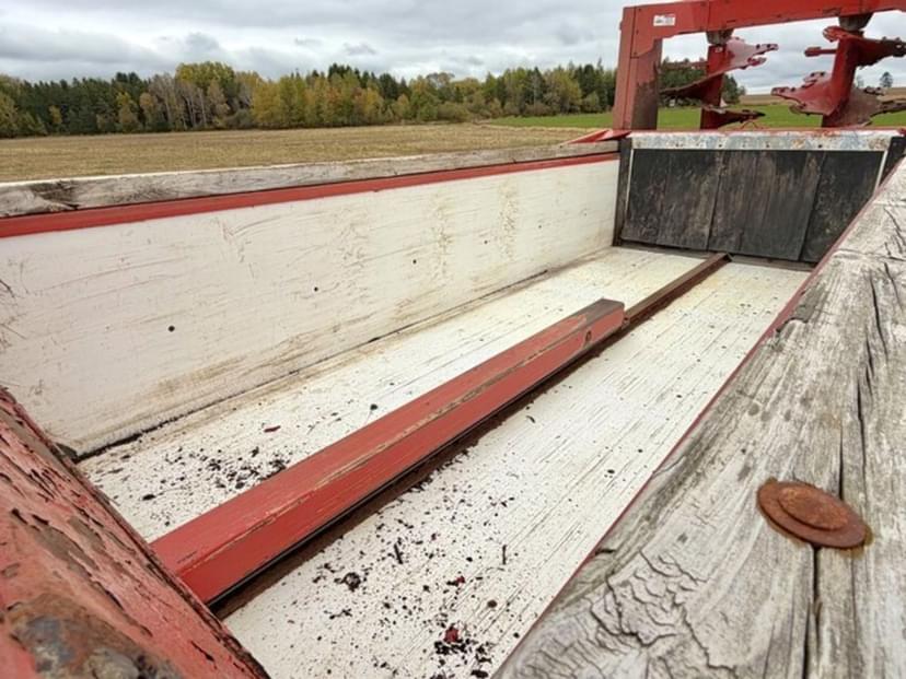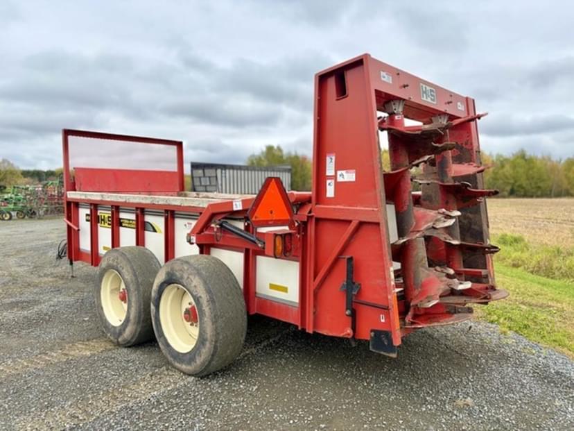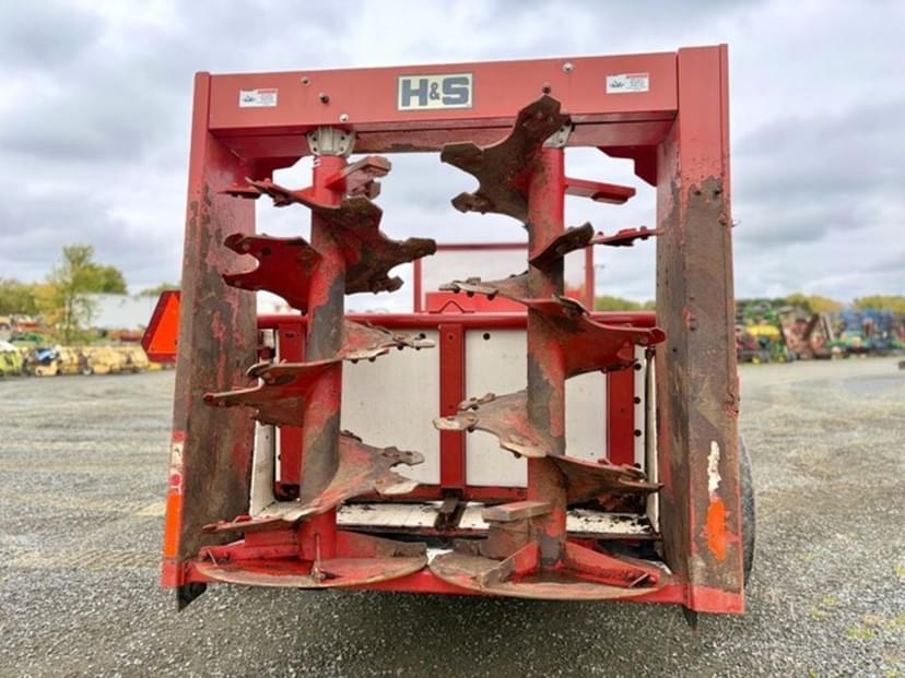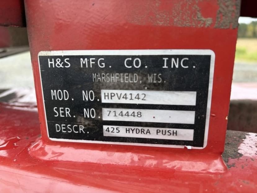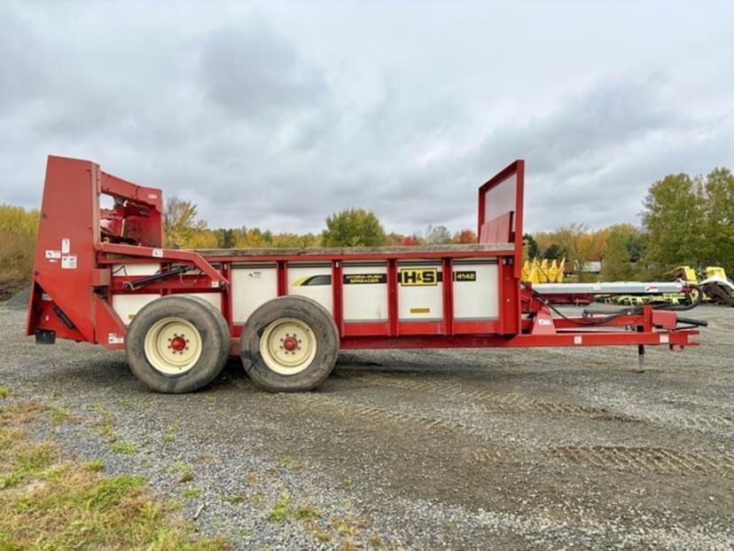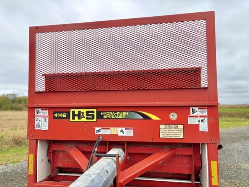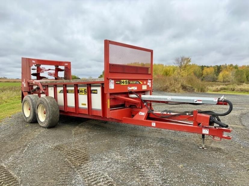 Used 2017 H&S HPV4142 Hydra-Push spreader, 3.5" wood extensions, 1000 PTO, front top screen, poly floor, poly sides, hydraulic endgate, twin vertical beaters, tandem axle with 385/65R22.5 tires, highway lights.