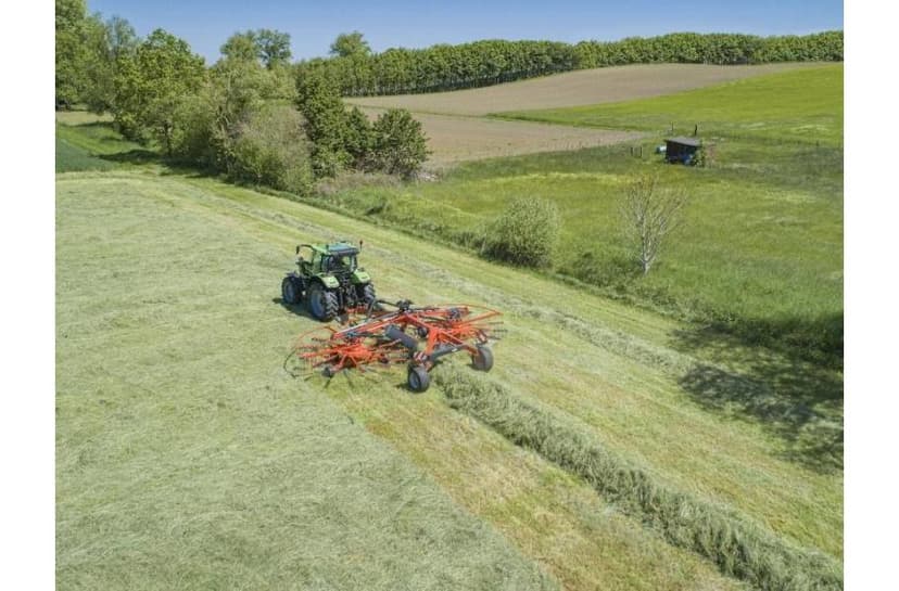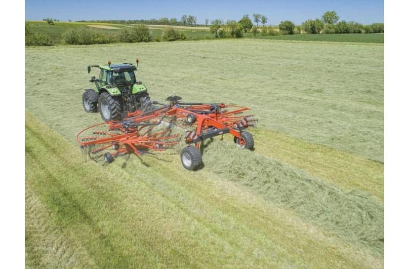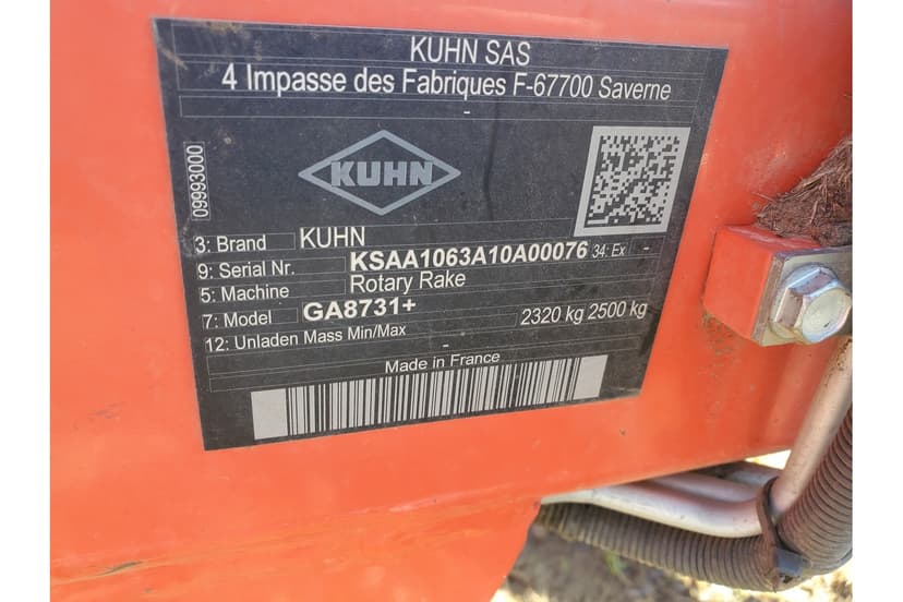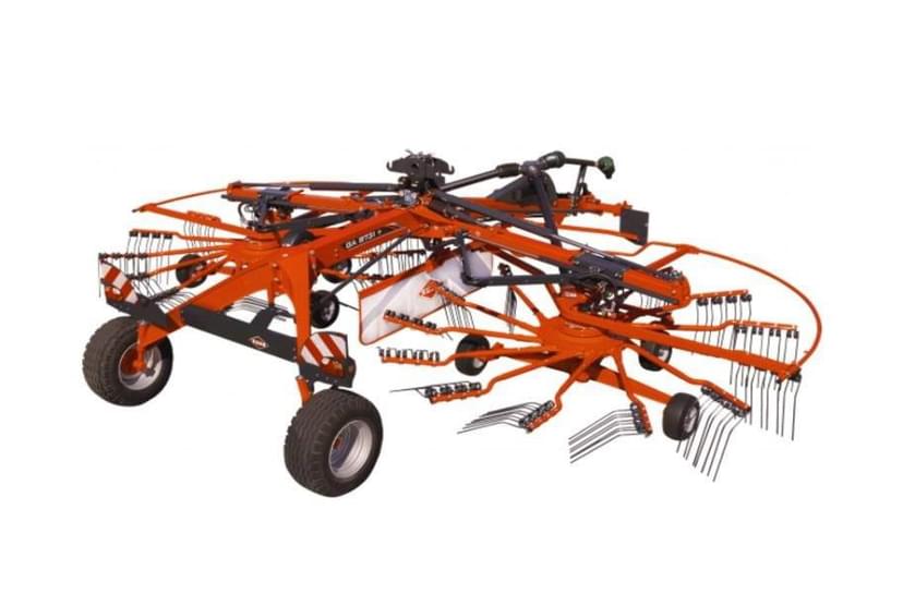 Kuhn GA 8731+ Create the Perfect Windrow! The GA 8731+ and 9531+ central-delivery rakes, with fast forward speeds and excellent raking cleanliness, create the ideal windrow for making round or large square bales. Working Widths: 25'3" to 30'6". The redefined KUHN GA 8731+ and GA 9531+ center-delivery twin-rotor rotary rakes are built on the popularity of the prior generation of KUHN's twin-rotor rakes with the incorporation of the Masterdrive® GIII double-reduction gearbox. The main gearbox features the KUHN exclusive double reduction drive that not only provides consistent windrow formation in varying crop conditions, but also improves the power flow through the gearbox. These models have a lighter, but stronger construction with aluminum rake arm housings, large cam bearings and cam track designed to reduce peak loads. They maintain the KUHN double-bend tine arm design that offers clean raking and excellent capacity for consistent, fluffy windrows. The GA 8731+ has fixed tine arms. For operations where transport height is a concern, the GA 9531+ has easily removable tine arms. Heavy-Duty Components for Long Service Life Masterdrive® GIII Gearbox The patented KUHN Masterdrive GIII double-reduction gearbox is designed for heavy crops, tough field conditions, and intensive use. Key components have been improved to build lighter, yet stronger rotors such as: aluminum alloy housings, optimized cam track minimizing force on the follower bearing, larger follower be