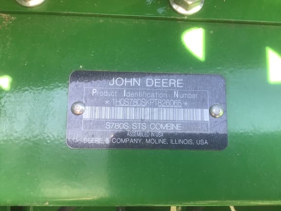 2023 JOHN DEERE S780 *PRWD *580/85R42 FRONT DUALS *620/75R26 REAR TIRES *PREMIUM CAB *ULTIMATE TECHNOLOGY *PREMIUM VISIBILITY *PRO DRIVE *COMMAND TOUCH MULTI-SPEED DRIVE W/ DUAL TILT FORE AND AFT *EXTENDED WEAR ROUND BAR CONCAVE *DEEP TOOTH SHOE *TRISTREAM ROTOR XTD WEAR *EXTENDED WEAR GRAIN HANDLING *POWER FOLDING COVERS *26 FT UNLOAD AUGER *DELUXE POWERCAST TAILBOARD *EXTENDED POWERTRAIN WARRANTY UNTIL 1500 HOURS OR JULY 26, 2026 Combine Type: Corn/Bean, Axle: PRWD, Duals/Singles: Duals, Chopper/Spreader: Chopper, Options: Yield Monitor, Options: Contour Master (Lateral Tilt Feederhouse), Options: Fore/Aft, Options: Active Yield, Options: Harvest Mobile, Options: Advisor Package, Options: Powercast Tailboard, Options: Power Folding Bin Extension, Header: No